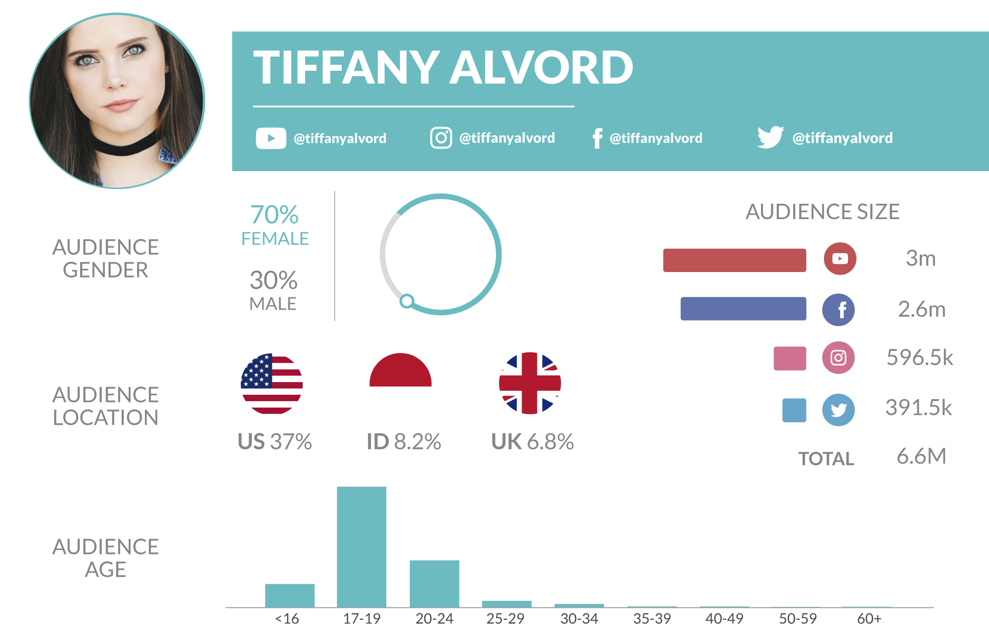 Her YouTube videos resemble the artists of whom she covers, making them more fun and entertaining to watch. She does collaborations with many other well-known influencers on this list, including Tiffany Alvord and Boyce Avenue. Most of her followers are predominantly female, and overall they live in California. These users associate with popular brands: Instagram, Starbucks, and Disney.